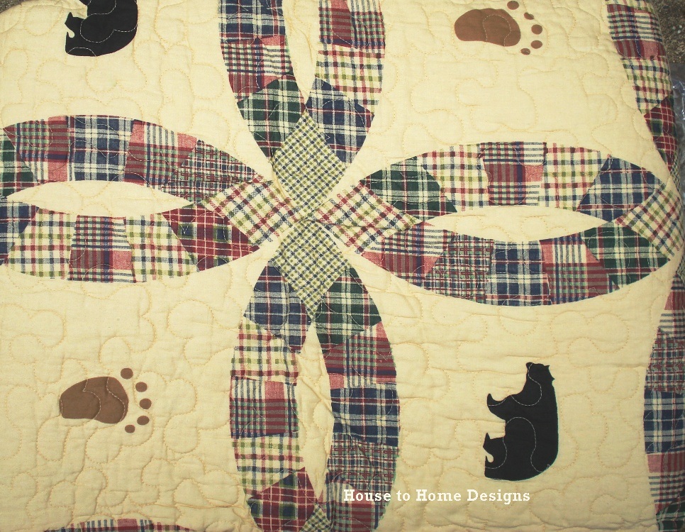 Inspired by the great outdoors, this quilt features printed black bear and bear paws centered in an interlocking wedding ring pattern on a cream background. The wedding rings display various plaid prints in navy blue, hunter green, burgundy, and cream. Reverses to a coordinating plaid that's in the wedding ring on the front. Nicely crafted, and 100% Cotton throughout. Set includes quilt + 2 standard shams.