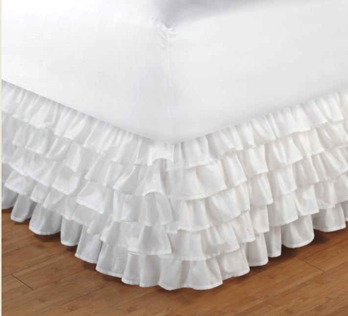 A multi-ruffled bedskirt that features layers of overlapping cotton blend ruffles. A romantic, sophisticated look for any bedroom. Corners are split (opened) to accommodate bed posts and frames.