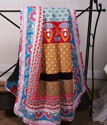Thalia Bohemian Quilted Throw. This comfy throw with its vibrant colors and medallion prints will be the perfect accent to any room. Pieced fabrics in florals and geometric prints with a touch of velvet reverses to a coordinated floral print.