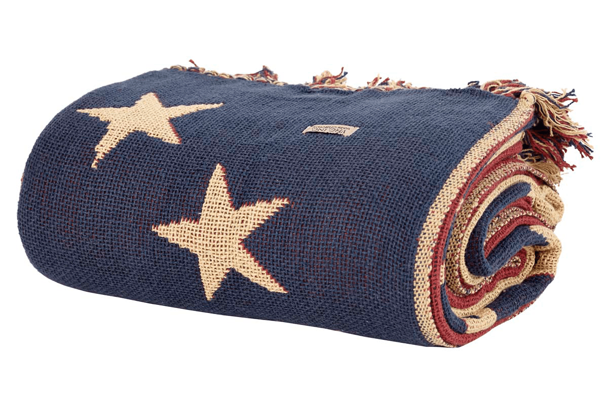 The Old Glory throw is crafted using a "jacquard weave". Boasting a large woven American Flag, this throw would be a wonderful accent to any patriot's favorite chair. Same image on the back with reversed colors, and finished with tassel fringe on both ends. Great gift idea! Click on smaller image to the left of a close-up view.